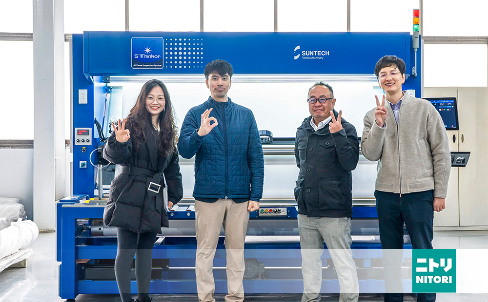 В январе 2026 года команда японского клиента NITORI посетила завод SUNTECH, чтобы провести испытания на месте и проверку недавно построенной машины для проверки тканей AI. Этот визит был сосредоточен на тестировании машин в реальном времени; клиент привез собственные фирменные ткани, чтобы всесторонне оценить работу оборудования в реальных условиях производства.